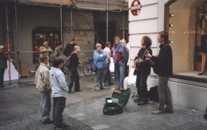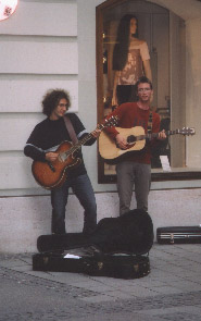 Den Vor- und Nachmittag verbringt jeder von uns in der Innenstadt nach seinem individuellen Interesse. Um 19 Uhr treffen wir wieder aufeinander, stellen uns in die Nähe des Stephansplatzes und fangen an zu spielen. Da wir mehrere Lieder lang keinerlei Reaktion bei den Massen an vorbeiströmenden Touristen erzielen, ziehen wir um und probieren’s noch mal. Wieder nichts. Wir sind enttäuscht und beschließen, an einer anderen Stelle noch einen letzten Versuch zu starten. Ganz oder gar nicht, wir stellen uns direkt auf den Stephansplatz vor den Eingang einer Apotheke, ein kuppelförmiges Vordach über unseren Köpfen (gut als Monitor), direkt gegenüber dem Eingang zum Stephansdom. Nach ein paar Minuten bleiben zwei Damen mit ihren Fahrrädern stehen, denen es sichtlich Spaß macht, uns zuzuhören. Bald werden es mehr, vielleicht zehn Leute, und wir lernen unsere erste und wichtigste Lektion im Auf-der-Straße-Spielen: Hast du zehn begeisterte Leute, hast du ruckzuck auch hundert. Zuerst ist es uns etwas unheimlich, dass mehr und mehr Menschen stehen bleiben, wir geben es auf, das Geld mitzuzählen, das in den Koffer geworfen wird. Wir werden lockerer und lauter, bewegen uns freier, verlieren die Befürchtung, dass die ZuhörerInnen uns zwischen zwei Liedern weglaufen könnten, trauen uns, kurze Pausen zu machen und gelegentlich auch mal ’ne Ansage. Irgendwann ist es kaum mehr nötig, die Leute zum mitsingen und mitklatschen aufzufordern und zu animieren, sie tun das ganz von allein. Einzelne tanzen sogar. Da nur etwa die Hälfte unseres Repertoires für Straßenmusik geeignet ist (die andere Hälfte ist zu sanft und zu leise), kommen wir nicht umhin, bestimmte Lieder zu wiederholen. Aber auch das scheint niemanden zu stören. Vor schätzungsweise 200 im Halbkreis vor uns stehenden Menschen spielen wir uns in eine Art Rausch, singen, tanzen, machen Faxen und Blödsinn, also genau das, was das Publikum sehen will. Die Geldmünzen plätschern nur so in den Koffer, es sind sogar einige Scheine darunter. Bei „Hey Jude“ lassen wir am Ende die Leute alleine singen und tun so, als ob wir zusammenpacken würden. Wie wir gehofft haben, protestieren sie heftig, und so „müssen“ wir weitermachen. Von einer jugendlichen Gruppe aus Deutschland werden wir mit Bierdosen „bezahlt“, und obwohl keiner von uns gerne Bier trinkt, kommt uns diese Erfrischung sehr entgegen. Wir nehmen Liedwünsche entgegen und erfüllen sie, wenn’s irgendwie geht. Unsere Flyer mit Kontakt- und Internetadresse gehen weg wie warme Semmeln. Während die Japaner im Publikum tagsüber damit beschäftigt waren, die Sehenswürdigkeiten zu fotografieren, knipsen sie nun uns. Nach zweieinhalb Stunden ununterbrochenen Spiels treten schließlich zwei freundliche Polizeibeamte in den Halbkreis: Mehrere Anwohner hätten sich beschwert und Straßenmusik sei eigentlich auch nur bis um zehn erlaubt. Einfühlsam wie die Wiener sind, lassen sie uns noch eine letzte Zugabe spielen, und ernten dafür von den ZuhörerInnen einen extra Applaus. Mit „Let it Be“ verabschieden wir uns von dem tollen internationalen Publikum, das mehr zur Show beigetragen hat, als wir selbst. Hinterher führen wir ein paar nette kleine Unterhaltungen in verschiedenen Sprachen. Die vielen Münzen kommen in ein extra Fach im Gitarrenkoffer, und der ist ganz schön schwer und unhandlich, als wir aufbrechen. Noch halb berauscht von so viel unerwartetem Erfolg haben wir das Gefühl, ganz Wien müsste uns kennen, als wir durch die Fußgängerzone laufen und uns eine kleines Restaurant aussuchen. Hier feiern wir mit Rotwein und Tequila, kommen aber auch wieder auf den Boden zurück. Da unsere Einnahmen im kleinen Zwei-Mann-Zelt nur schlecht sichten lassen, erledigen wir das später in einem Bus-Wartehäuschen in der Nähe vom Campingplatz. Das Zählen dauert fast solang, wie das Spielen.  |