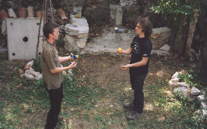 Fr, 05. September '03 Eine längere Fahrt nach Kroatien steht uns bevor. Mein Vater hat in der Nähe von Crikvenica ein kleines, halbverfallenes Ferienhäuschen, in das wollen wir uns einquartieren und die inspirierende mediterrane Umgebung im Garten für ertragreiche Proben nutzen. Wir fahren über Zagreb und machen dort Mittagspause in einem Park. Beim Bäcker gibts ein oberleckeres Blätterteiggebäck (ne Art Börek), das in der Auslage so wunderbar vegetarisch anmutet, dass selbst Raphi eines kauft. Als sich beim essen herausstellt, das es mit Hackfleisch gefüllt ist, kann ich mich glücklich schätzen, nun habe ich gleich zwei von den aparten Köstlichkeiten. Das Autofahren in Zagreb ist ein Abenteuer und wir sind froh, als wir wieder heil auf der Autobahn sind. Irgendwann liegt vor uns das Meer und wir haben einen fantastischen Blick. Wir fahren durch Rijeka und Crikvenica immer der Küste entlang, bis wir schließlich nach Selce und dann nach Novo Vinodolsky kommen, wo wir uns von ein paar kleineren Felsbrocken erst mal in die Fluten stürzen und erfrischen. Das Wasser kommt uns beiden etwas sehr salzig vor, aber man kann sich das ja logisch erklären: In einem so heißen Sommer ist viel Wasser verdunstet und wenig neues Regenwasser dazugekommen, da steigt der Salzgehalt natürlich an. Physik hin oder her (hab ich in Klasse 12 übrigens abgewählt) - vielleicht waren wir beide einfach schon lange nicht mehr am Meer. Nach einem einfachen, supergünstigen Abendessen in Bribir suchen wir das abgelegene Ferienhaus und finden eine schwer sanierungsbedürftige, wild-romantische Ruine. Es gibt dort sogar Strom und zwei Matratzen, auf denen wir erledigt von der vielen Fahrerei schnell in den Schlaf sinken.  |